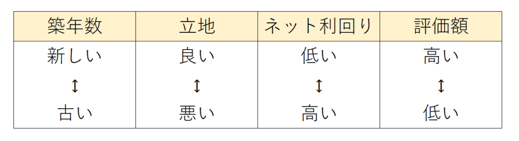 築年数や立地によって評価の基となるネット利回りは変わります。