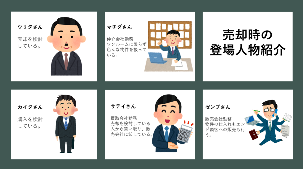 ゼンブさん:ワンルーム販売会社勤務。エンド顧客(カイタさん)への販売力もある。提携銀行あり。物件の仕入れも行うがなかなか時間が無い。